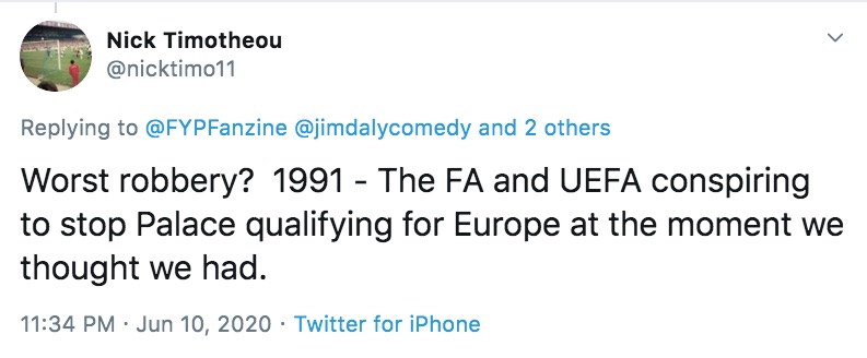 I still to this day remember the deep sense of injustice that I felt when we were relegated thanks to that single point that West Brom managed to secure at Manchester City, and think it definitely qualifies as a heinous example of daylight robbery at Palace's expense.