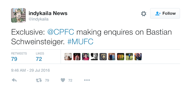 Finally, here's one from the wonderful world of Twitter. Football "agent" Indy Kalia has tweeted that Palace are keen on Manchester United midfielder Bastian Schweinsteiger.
